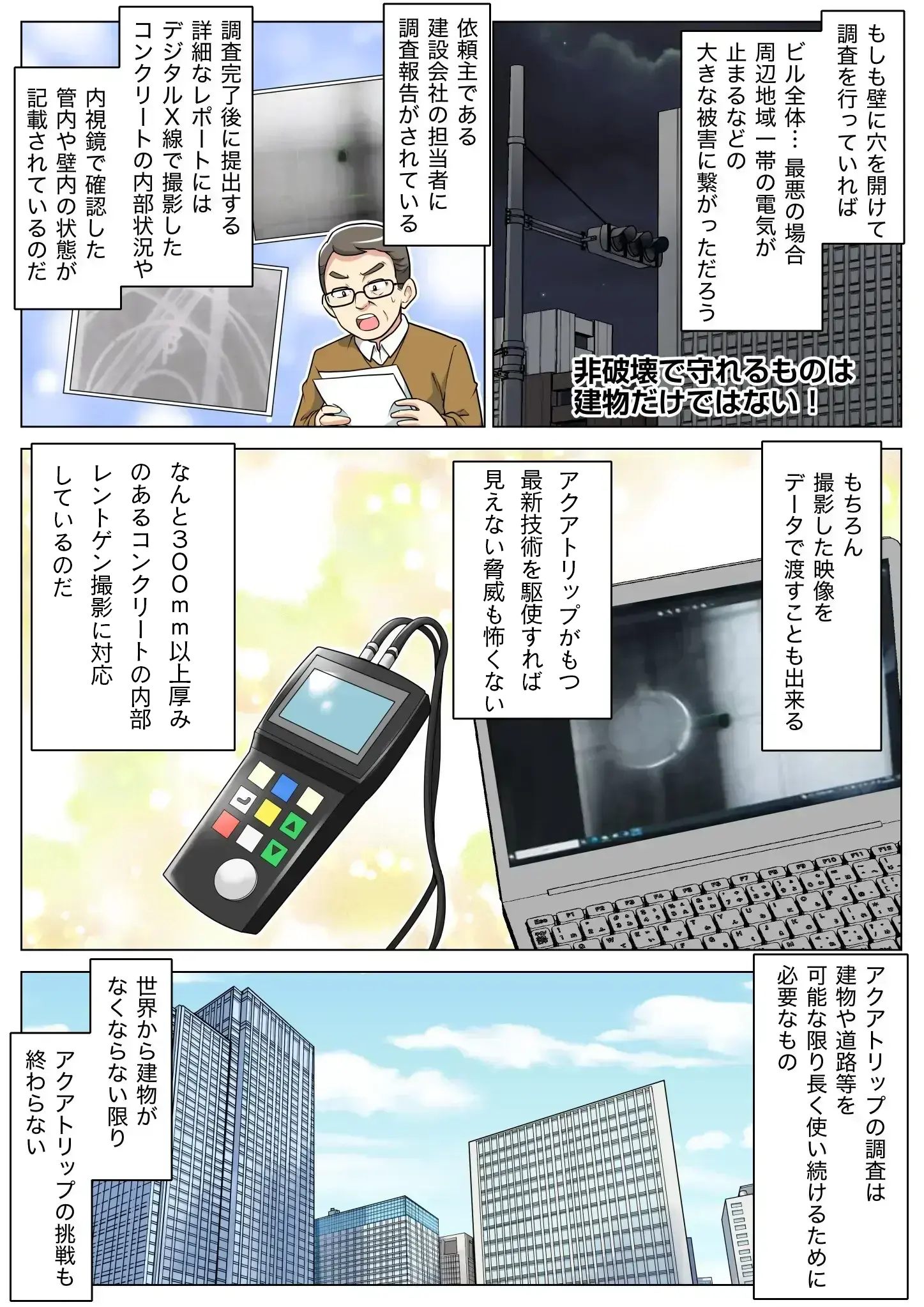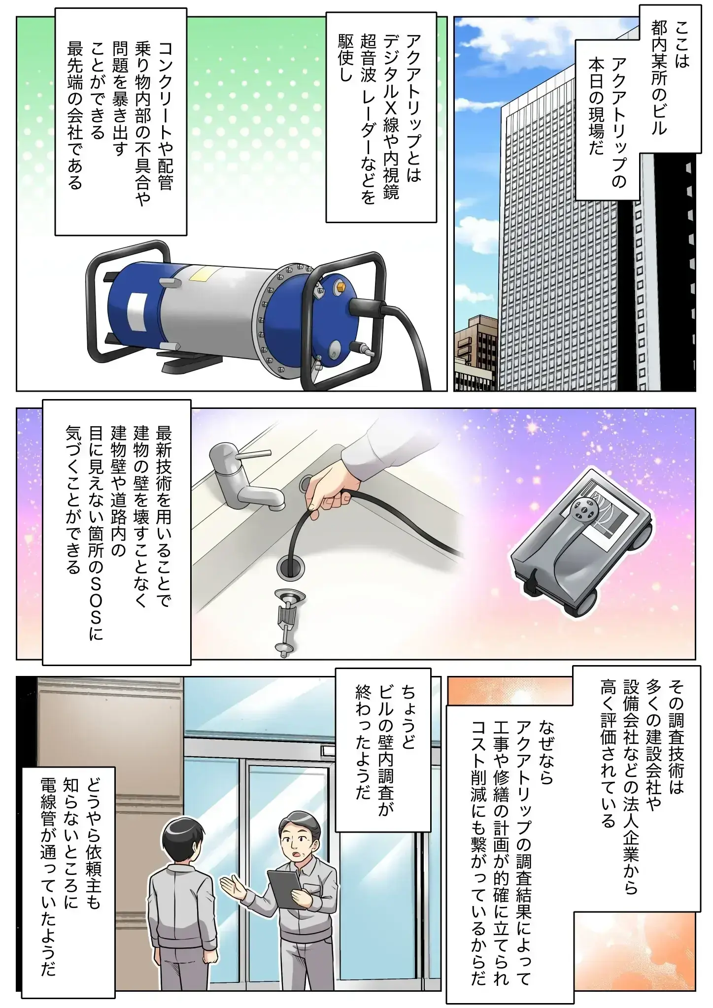 普段見ることのないコンクリート内部は、覗いてみると劣化している可能性があります。アクアトリップは、最新技術を用いて建物に傷をつけることなく、瞬時に不具合を発見します。劣化を防ぎ、安心の設備環境を守りましょう。